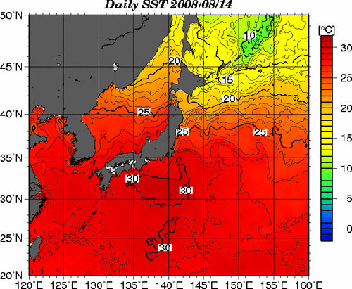 昨日の日本近海の海水温です。30℃あります。この海水温に刺激されるのか、南海上の熱低が台風に変わる予報が出されています。