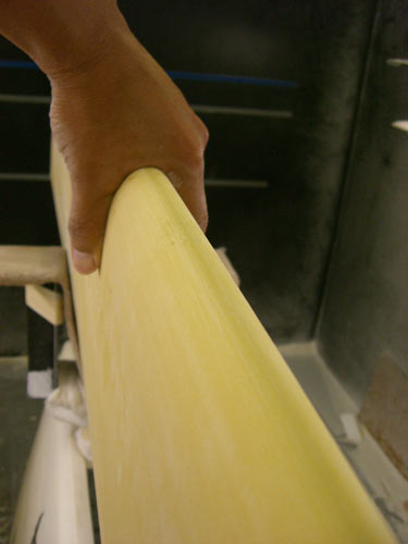 こちらは私のニュースタビー(最初のも乗ってないのに…)1本目との違いですが、まずレングスを6インチ伸ばして、7’6”にしました。ボトムは一本目はセンターにシングルコンケーブを入れましたが、今回はフルロールボトムで、レールも意識的に薄くしてもらいます。それから、ロッカーも大きく変えています。8.6のブランクスからアウトラインを切り出しましたが、切り出す位置はこれまで作ってきたボードと違う位置です。ダウンザラインの気持ちよさ、スタビー特有のスタンスでのサーフィンをイメージしています。おそらく本家のスタビーとほとんど同じシェイプになると思います。