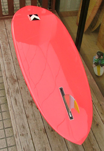 シングルコンケーブが深く長く入り、ずんぐりした見た目とは正反対の動きをしてくれるシングルフィンです。もともとはカツさんが大きな波をレイトテイクオフで滑り降りて、大きなラインでクルーズするために作ったボードでしたが、ヒザ、コシの小さな波でもオールラウンドに楽しめるボードです。シングルフィンならではの気持ち良いダウンザラインが楽しめるボードです。詳しい画像はのちほどサイトにアップいたします。