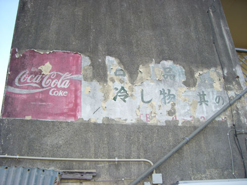 沖縄の共同売店の看板。台風のせいか壁に直接書かれた看板をたくさん見かけました。