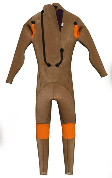 オレンジ色の脇の下とヒザ裏は首部でも使用している、のびーるエアストレッチを使用しています。背中ジッパーの背当てはダブルフラップで水の浸入を極力防ぎ暖かな肌触りです。インナーネックを装着すれば(オプションです)さらに水の浸入を減らすことができます。