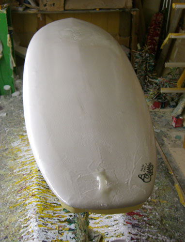 これはツィンフィン。5’8”で四角いテールのエンド近くに小さめのキールフィンが二つ付きます。ノーズを丸くしたら…?たぶん皆さんよくごぞんじのあのボードになりそう。テールのラインは少し絞り気味です。出来上がったらぜひ貸してもらいたい面白そうなボードです。