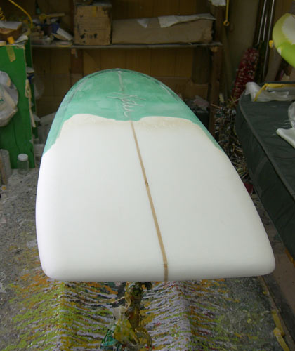 ロングボードのノーズを使ってミニシモンズ作成中。サンディエゴの人が見たら怒るかなあ~?ノーズコンケーブがちょうどいい具合に入ってるんです。この他にもパイポやベリーボード作っちゃってます。結構、こんなところから新しいアイデアが出てきたりして…。