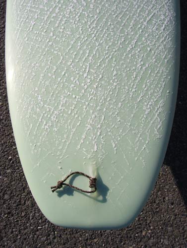 フィンはテールから14インチの位置。テール付近はフラットにせず緩めのロールにしたせいかカットバックがスムースです(比較的…)ニュートラルに近いバランスでカカト側に加重して、フィンのしなりを感じながらボードが向きを変えていくフィーリングはゾクゾクものです。