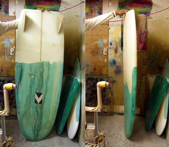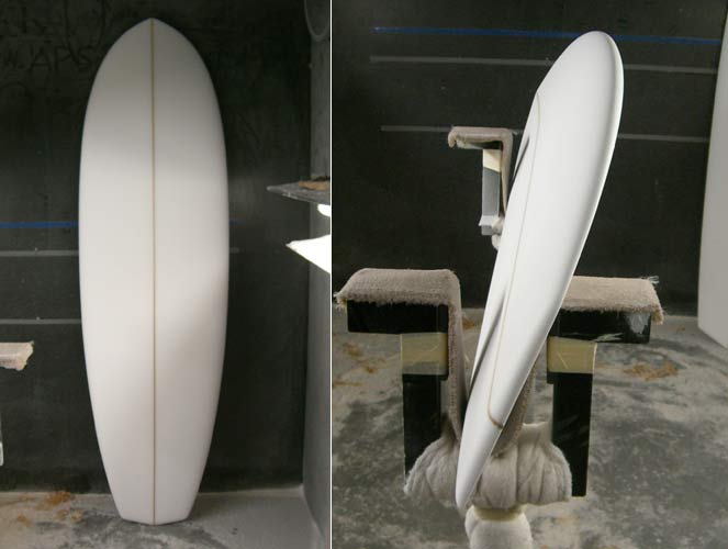 リメイクのミニシモンズ。ご覧の通りロングボードのノーズ部分ですがボトムはきれいに流れているので調子いいと思います。フィンは後ろの出っ張った部分をもう少しフォイルする予定です。リチャード・ケンヴィンさん、どうもすいませんという感じですが、真面目です。