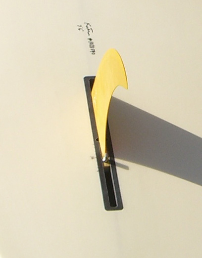 7’6”のディスプレイスメント・ハルのフィンです。拡大していただくとお分かりいただけると思いますが、フィンの根元に目盛りを書き込んでおります。現在の位置はテールから14インチ。14インチという数字に根拠はありません。ボードとのバランスを見ていままで乗ったハルの感覚を想像したらココになりました。目盛りは後で目分量でココだ!ってフィンを付けて計ったらちょうど14インチ。フィーリングってやつです。