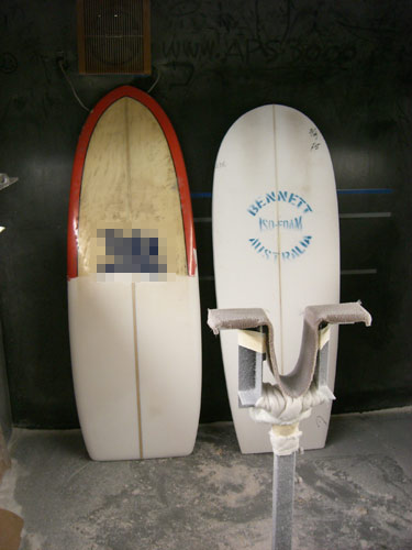 左のはノーズコンケーブを繋げてシングルコンケーブ掘りました。右のシェイプ中のボードは5’0。