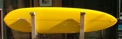 ミニは、6’8”が基本のサイズですが乗り手の希望や体格に合わせていろいろなシェイプが可能です。大会に出るのでなければ、9フィートにこだわる必要も無い訳で、ロングボードでは取り回しが大変という女性サーファーにもおすすめのモデルがこのミニです。ロングボーダーのセカンドボードにばっちりですが、一度乗ったらセカンドボードじゃなくなるかも(笑)シングルフィンやスタビでもOKです。
