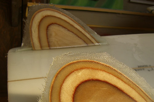 こちらはラミネート中。奥のブルーのフィッシュ?はクアッド、手前のはツインです。手前のボードはボトムを見ればフィンの位置にビビるはず(笑)スーパールースなスタンディングパイポ調なツインフィンになります(たぶん)私は昔のベリーボードのように足ヒレつけて腹で滑って遊んでみたいです。