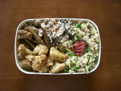 おかずは、ゴボウと鶏肉の炒め煮、カリフラワーの即席ピクルス、おからのうの花、カブの菜っ葉飯に自家製梅干。