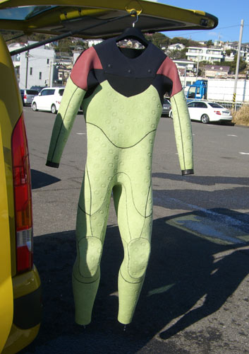 真冬用に作った3㎜の起毛タイプのジッパーレス、AXXE CLASSICのボヘミアンというモデルです。今朝は今冬一番の冷え込みだったらしいので、3mmという数字に若干不安を感じつつ入水しました。風が吹くと体感温度は下がりますが、3時間ほど入っていてもまったく問題ありませんでした。暖かいし3mmはかなり動きやすく、大げさでなくパドルがノーストレスです。裏返してみて気が付きましたが肩の部分はより動きやすい生地になっていました。その昔、決して柔らかくはなかった5mmのウェットに苦労していた頃と比べると、天と地くらいの差があります。真冬も快適に波乗りできるのは嬉しい限りです。脱ぎ着もかなり考えられていて、背中ジッパーのウェットスーツと同じくらい楽々です(ホント!)これ自信を持ってオススメできます。冬のサーフィンの強い味方になってくれそうです。