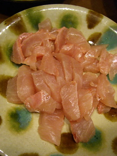 魚屋さんに三枚におろすところまでやってもらって、まず片身はお刺身で。皮を引いて包丁でぶつ切りです。