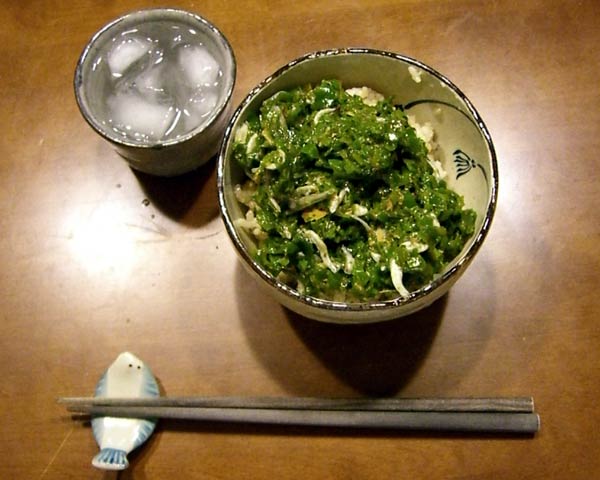 メカブトロロ+チリメンを玄米ごはんにとろりと乗せて出来上がり。芋焼酎が良く合います。