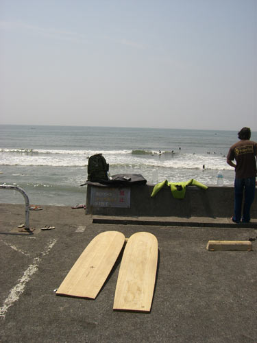 気が付くとすごい勢いで波のフェイスを走っていました。フィンがついていないただの木の板とは思えない安定感。テールがスライドし始めたので波側のレールに意識を集中するとしっかりとした反応で体勢が元に戻ります。