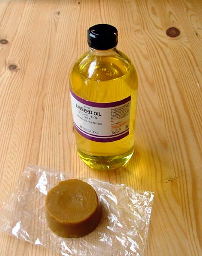 良く乾かしてから、木地のままの家具に使う亜麻仁油から作るボイル油というオイルを塗りこみますが、なかなか見つからなかったので同じ亜麻仁油成分のリンシードオイルを画材屋で買ってきました。油絵に使うオイルですがまさかサーフボードに使うことになるとは思いませんでした。