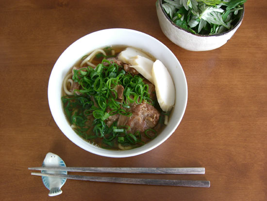 カツオでダシを取ってソーキの煮汁と醤油少々で香りを付けて塩で味付けのさっぱりスープ。ソーキとカマボコを乗せて刻みネギを乗せてできあがり。沖縄に行ったときに入った沖縄そば屋にフーチバ(よもぎ)のトッピングがあって、それが妙に気に入ってしまったのでフーチバも乗せます。