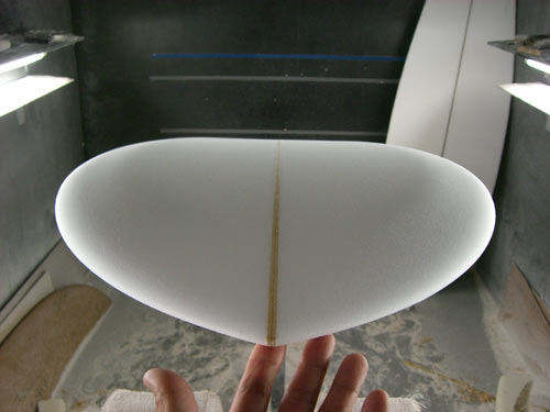 これは店置きのラウンドノーズフィッシュ。レッドウッドのウェッジストリンガーを使いました。おそろいのストリンガーでハルもシェイプしてもらう予定です。このブランクス、ロッカー最高です(カツさん、トシさん談)