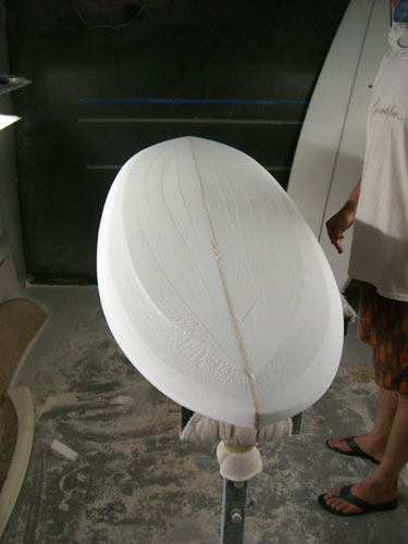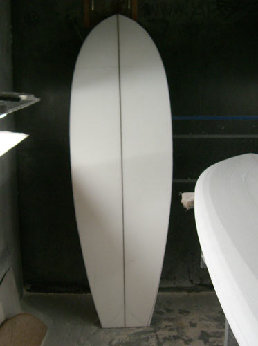 そしてまたシェイプルーム。リシェイプは終了。これはHさんのオーダーのMINIモデル。テイクダウン終了。シングルフィンで乗りたいというオーダーにカツさんがシングル用のスペシャルチューンを加えてくれています。期待しててください。のちほど途中経過画像を送ります。