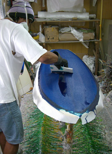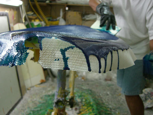 深みのあるネイビーティントを使ってバットテールのクアッドをラミネート中。きれいな紺色です。
