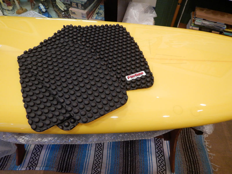 どちらもニーボードの特徴です。それから、このパッドもニーボードならでは。ショートボードに貼るデッキパッドよりも柔らかいですが、トラクションはしっかりしていてヒザから下をしっかり支えてくれます。そのままだと、幅が少し広すぎるのでカットしました(このパッドのメーカーのニーボードは、もっと幅が広いのです)