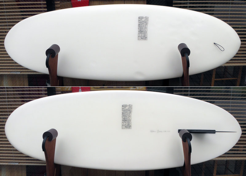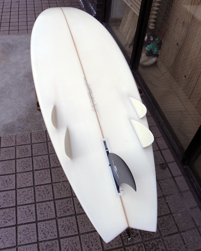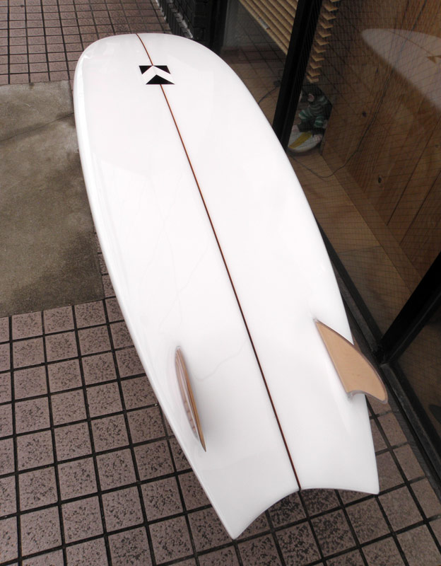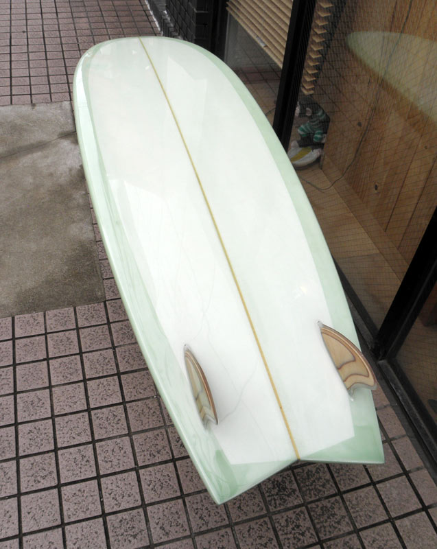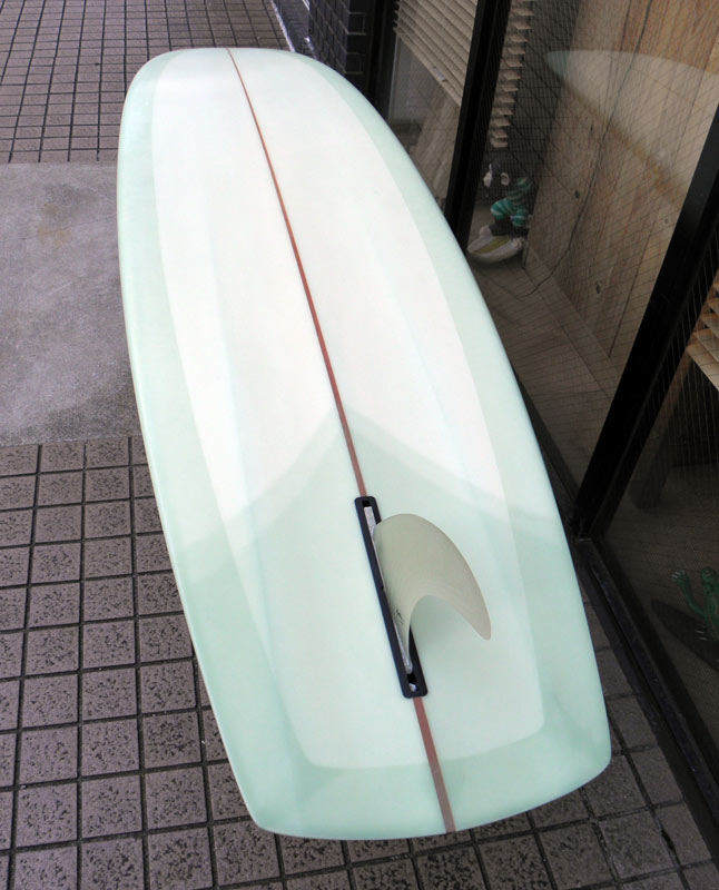私のは長いフィッシュを作ってみようと思い付いて作った最初のシェイプなので、テールが少し絞り気味です。今皆さんに作っているのは、もう少しフィッシュテールが広くなります。