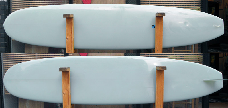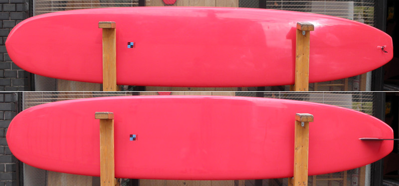 二本とも丸いノーズとパラレル気味のアウトラインで、同じように見えるかもしれません。でも、ボトムの形状、ボリュームのバランス、ロッカー、フィンのセッティングなど、それぞれ違うものです。これだけ違えば、二本は違う性格の別のボードであるとお分かりいただけるとおもます。