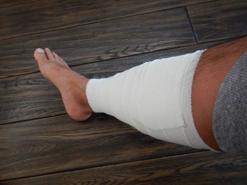 なんとか自宅へ戻ってまずはアイシングです。患部を高くしながら冷やします。15分ほど冷やして近くの病院へ(アイシングは長くても15~20分程度で)病院で湿布をもらい、丈夫な綿製の包帯で固定してもらったら少し楽になりました。ゲートルの要領ですね。