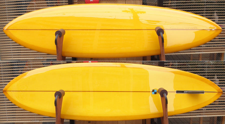 幅は23インチ。DフィンのPIGよりも広いです。自然なロッカーが入っています。スムースなボトムはボードが出来上がったらショップへ見に来てください。