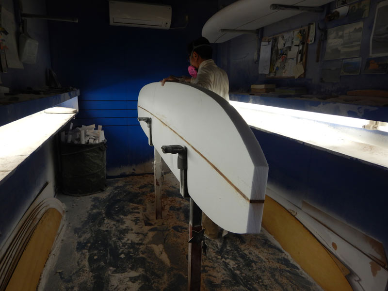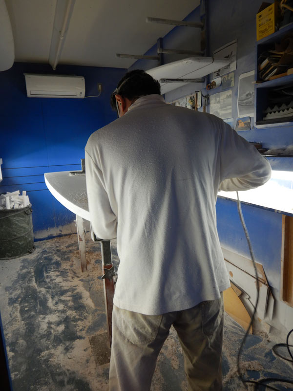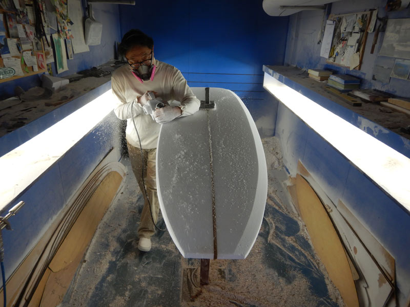 背中に隠れて見えませんがプレーナーを使っています。活さんの背中、大きいです。数えきれない本数のサーフボードを削って、世界の波に乗ってきたサーファーの背中です。