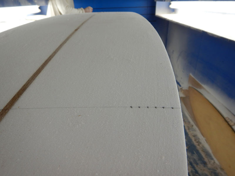 全体の大きな流れを作ったら、レールとボトムを作っていきます。シェイパーによって方法はそれぞれですが活さんはこんなマークを要所に付けます。切り口を正確に整えたことからつながっています。