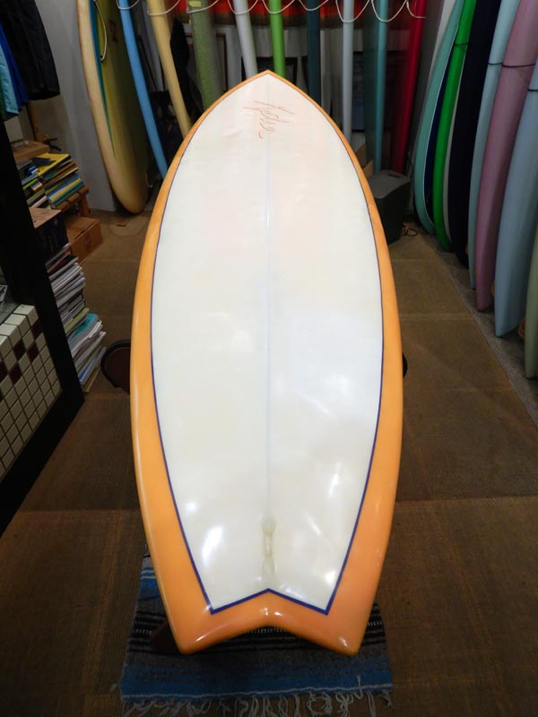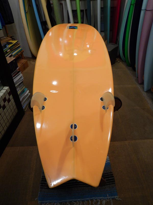 6’2”x20”x2”1/2 スワローテールでオーソドックスなアウトラインのホットマンゴーです。写真写りがいいのでピカピカに見えますが、使い込まれてフットマークがしっかり入っています。ボトムもヘコミ数か所とリペア跡があります。価格は現金プライスで税込み¥25.000でフィン付き。店頭お渡しのみです。