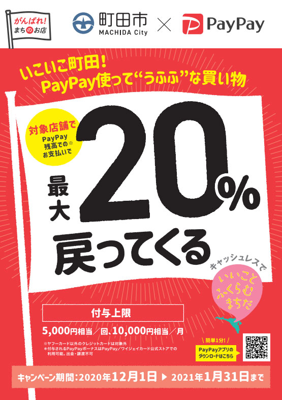 キャッシュレス決済のPaypayと町田市の共同企画で、ご利用金額の20%がPaypayボーナスとして還元されるというキャンペーンが、2020年12月1日から2021年1月31日まで開催されます。