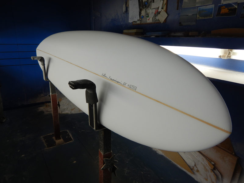 シェイプルームでは、私の8’4”が出来上がっておりました。これで同じサイズで三本目です。サイズ違いでは、6.9、7’3”、8.0、9.0です。PRIMO、どれだけ気に入っているのかお分かりいただけると思います。
