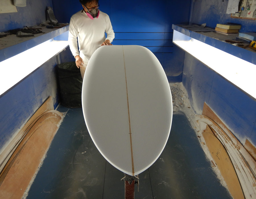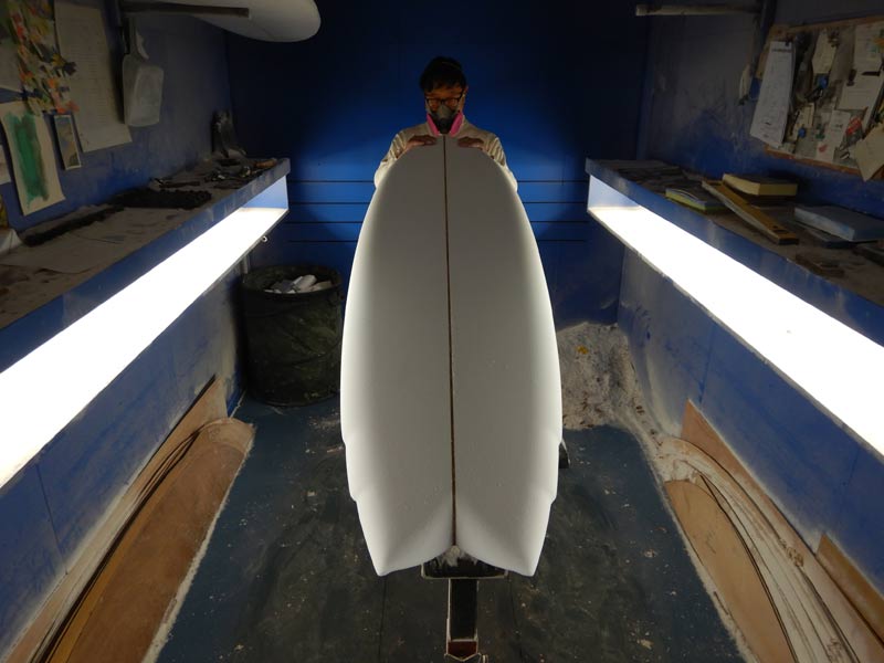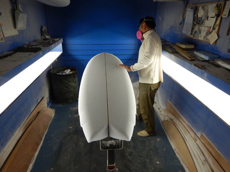 これからラミネートです。このレールのエッジのラインやテールのコンケーブの配分が活きるのもラミネートの優れた技術があってこそです。仕上がりの美しさはもちろんですが、グラスロービングやフィンBOX、プラグの入り方を見れば、技術の高さはお分かりいただけると思います。