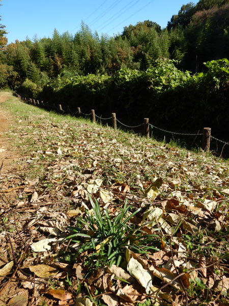 落ち葉に埋もれるように緑の葉を出しているのは、秋のお彼岸に赤い花を咲かせていたヒガンバナの今の姿。