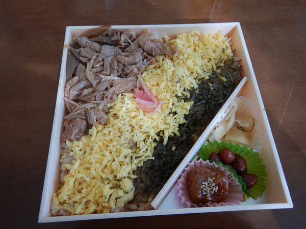 かしわ肉のしぐれ煮と卵と海苔の素朴な弁当です。