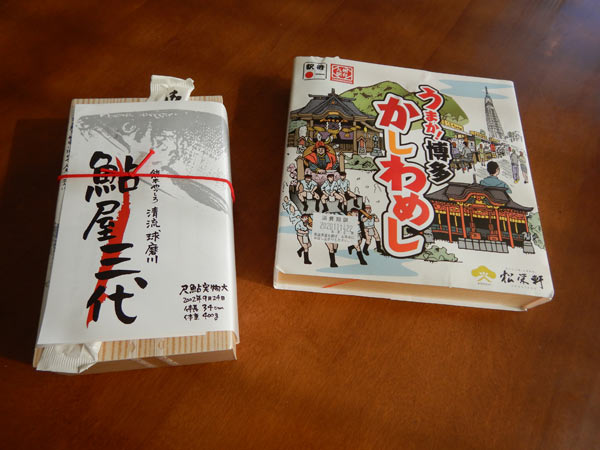 トレイルと里山をゆっくり歩いて、途中立ち寄った農産物直売場で駅弁祭りをやっていたので、昼食に買ってきました。鮎好きの女房は鮎弁当、私はかしわめしです。