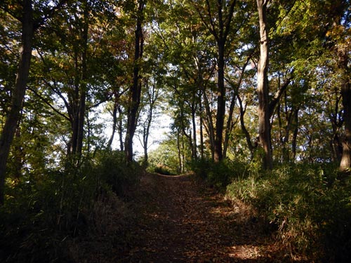 歩道は落ち葉で覆われています。途中でクルマが走る道路と交わりますが、クルマは低いところ、歩道は高いところ、というように設計されているので、車道とは全く出会わずにずーっと走っていけます。