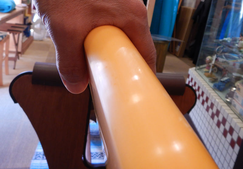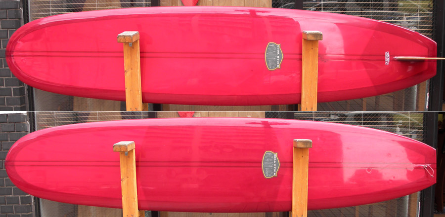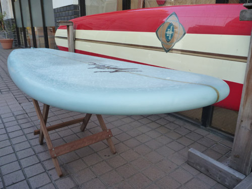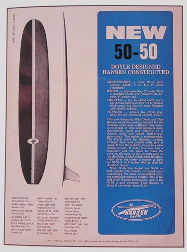 50/50というのはその通りのコンセプトで、10フィートオーバーが普通だった当時のボードを短くして取り回しを楽にして幅を広げてノーズへ行きやすくという、動きもノーズもイーブン(50/50)に良いというのが売りでした。そのコンセプトで作られたのがこのHODAD(陸サーファー みたいな意味)です。