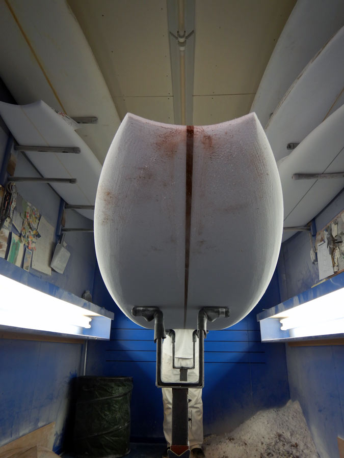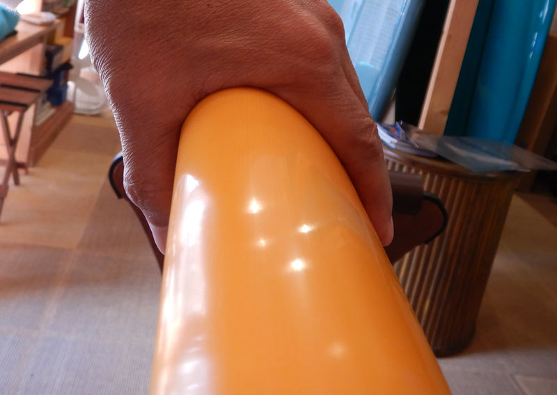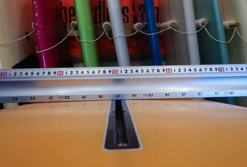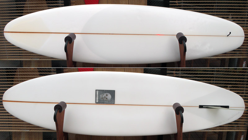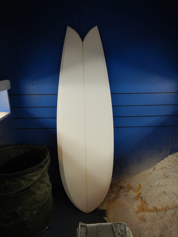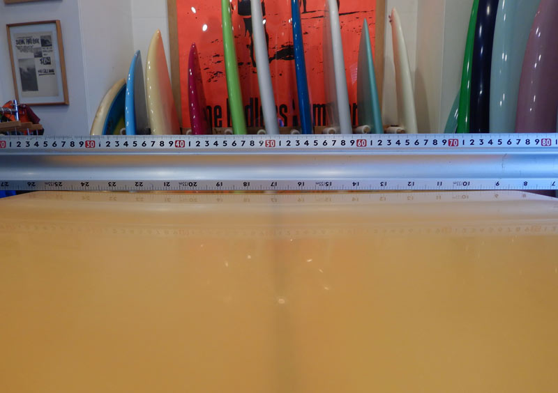 フィンはシングル。これは想像がつかないボトムシェイプです。どんな感じなのか乗ってみたーい。出来上がったらぜひ貸してください。