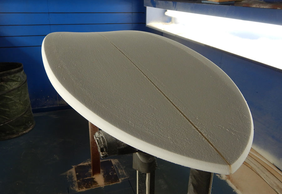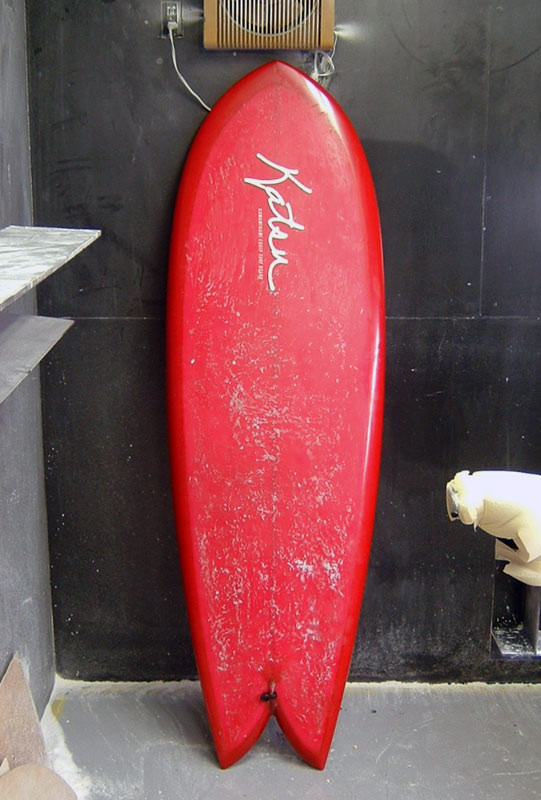 ストックのKK FISHをシェイプしていただいています。サイズは5’8”。オリジナルサイズは5’6”ですが、少し浮力多めに5’8”です。最初のKK FISHは2004年ですから、16年間作り続けられているモデルです。根強い人気があります。