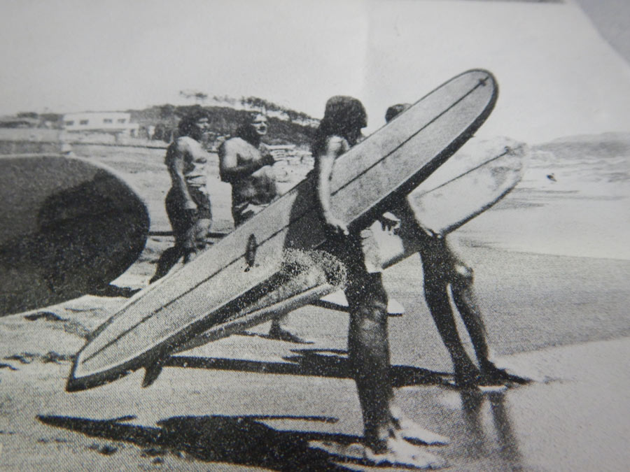 ボードを抱えているのはもちろん川南活さん。ずいぶん昔の七里ガ浜です。後ろの景色が今とは全然違います。70年代の初めでボードはもうショートボードになっていた時代ですが、このロングボードはずいぶん調子良くてお気に入りだったそうです。
