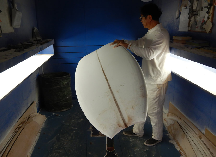 昨日が十三夜の月だったのとは関係無いと思いますが、活さんはムーンテールのロングボードをシェイプしていました。長さは9’8”。ご自分で乗られるみたいです。
