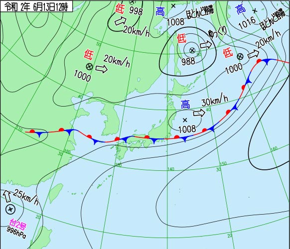 梅雨時には波は無いというのは昔から言われていることですが、そうとも限りません。前線は確かにうねりを遮る邪魔な存在ですが、前線が停滞する梅雨時はこの前線の動きで波が立つこともあります。