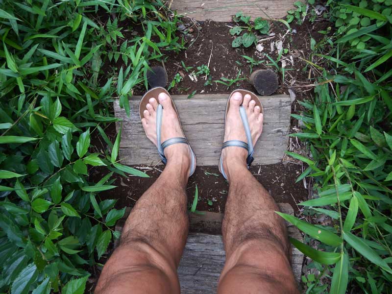 まずは歩いてみてください。足さばきの基本は身体の真下で、重心を先に前に出しつつ足裏の前方(フォアフット)で着地することです。ビーサンでは脱げないようにつま先をあげる動きになるのでフォアフットウォークは難しそうです。カカトにストラップがあるサンダルなら普段歩いているときにも、フォアフットのフォームで歩くことができると思います。