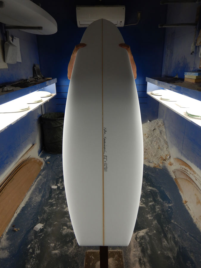 求めたものはフラットロッカーとDフィン、そして幅の狭さでした。フラットにしたロッカーとDフィンの組み合わせの面白さに気が付いたら、今度はボードの幅が気になり始め、だんだんと狭くなり、22インチ幅になりました。