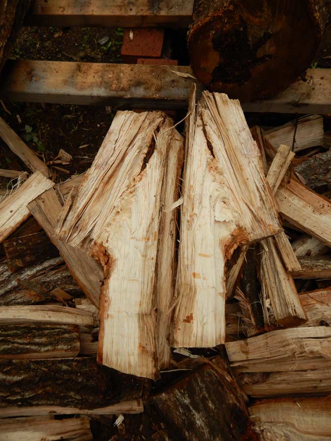 枝分かれした部分でうまく割れました。繊維の向きがあちこちなのが分かります。これはこのまま乾燥させることにします。