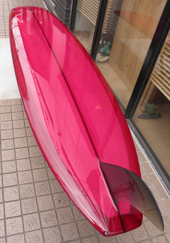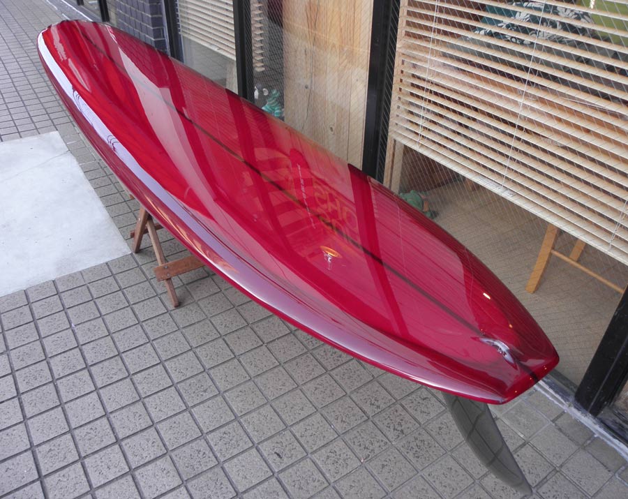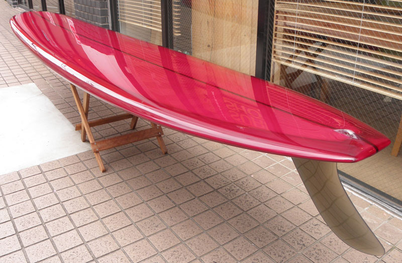 ほんの触りだけご紹介した、私の新しいログ。ばっちり撮影したのでお披露目です。レングスは、9フィート6インチ。ボルドーのティントカラーでラミネートしました。ピッカピカです。