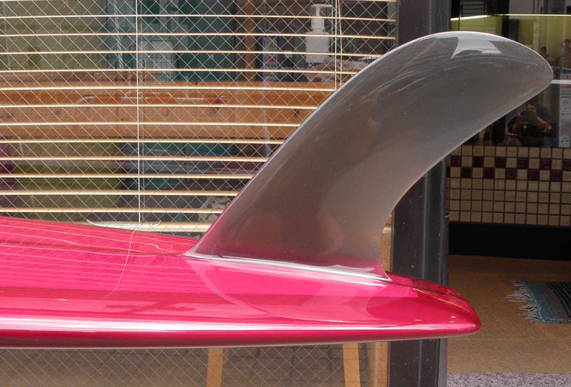 フィンよりも後方は急激に薄くなるようにシェイプされているのは、その部分の浮力を減らし急激な方向転換に対応させると同時にテールにフレックスを得るためと考えられます。