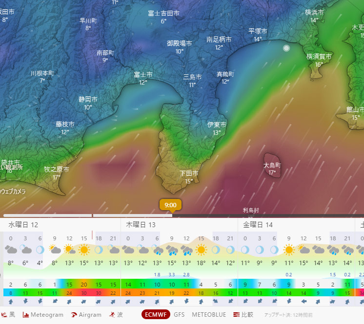 明日の相模湾の風予報です。昨日くらいまでは、午後からオフに変わるような予報でしたが、ずっとオンショアになっちゃいました…久しぶりにサイズがある波でできるかと期待してましたが、ちょいとジャックっぽいです。
